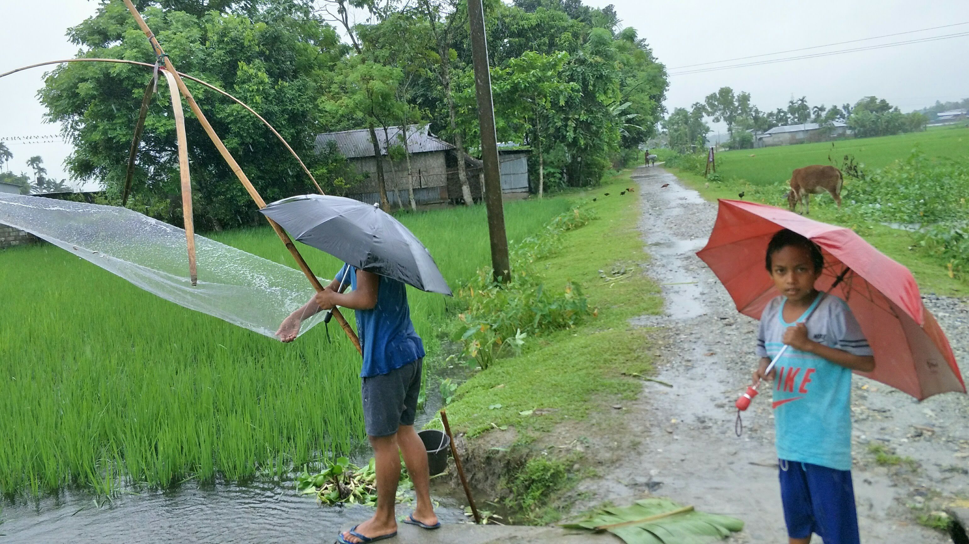 I go out with an umbrella. As rivers and ponds overflow, fish comes with the flood to the agricultural fields. In those interludes between spells of rains, people come out with nets and fishing rods to catch fish in the streams and the paddy fields with knee deep water. I quickly position myself and take snaps for my recollection of the visit later or a Facebook post for my friends to enjoy the beauty of life in my native place.