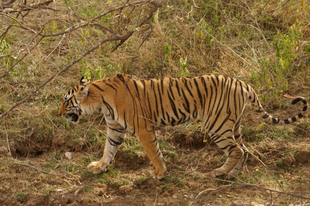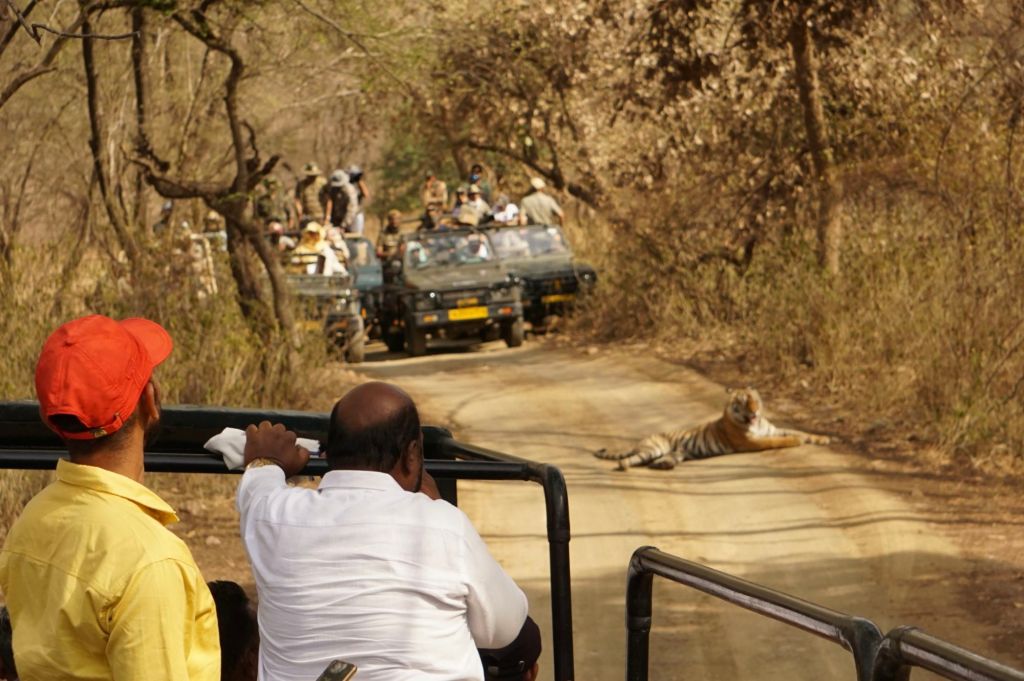 At Ranthambhore Tiger Reserve, the part of the forest open to tourism is divided into five zones: zones 1, 2, 3, 4 and 5. It was on a hot afternoon of April that our safari canter entered the zone 2 and had to stop, seeing other tourist vehicles stranded there. A young tiger stretched itself in the middle of the road and was in no mood to leave. I brought out my camera, clicked just enough photos for remembrance and was done with it. So did the other tourists as the tiger turned to its left and to its right and then towards us to have a good look at the tourists.